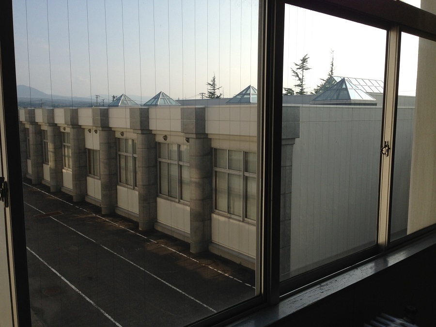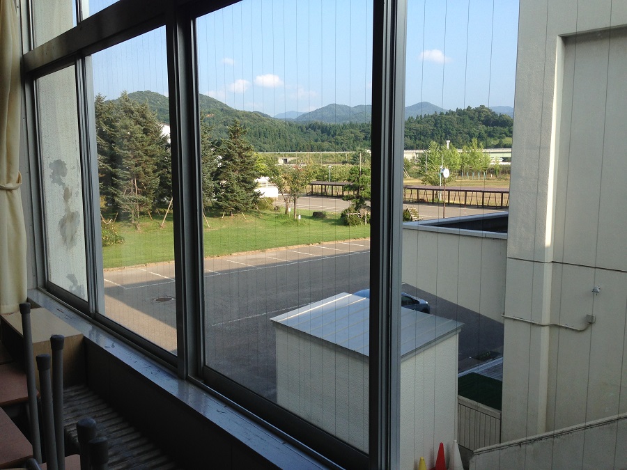 コミュニティホールから見た景色。学校敷地には入れないようにチェーンがされています。