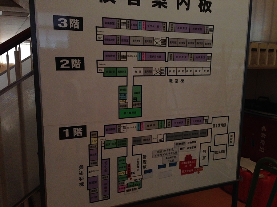 校舎案内板には、30年記念メモリアルパネル展や卒業式会場についてのマグネットが貼ったままになっていました。